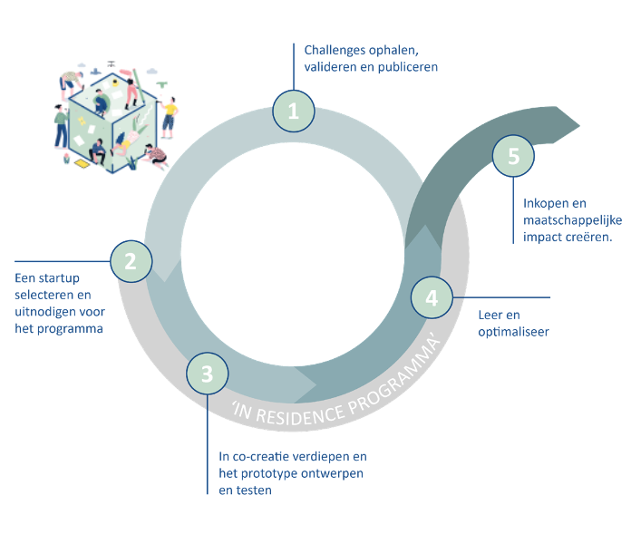 Per jaar vinden twee challenge rondes plaats. Elke ronde doorloopt het onderstaande proces om de beste match tussen ondernemers en overheden te faciliteren. Fase 1 en 2 draaien om het werven van de juiste start-ups / ondernemers met oplossingen, in fase 3 en 4, het programma, worden de winnende voorstellen in co-creatie doorontwikkeld tot werkende prototypes. Bij succes volgt fase 5: opschalen!