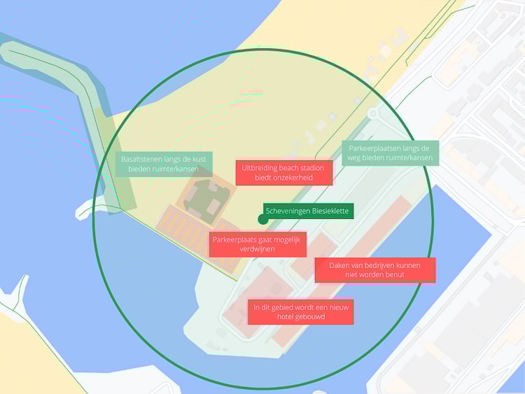 Het werkgebied beslaat een cirkel met een straal van ongeveer 300 meter rondom de Biesieklette op het Noordelijk Havenhoofd. Ideaal is als de oplossing schaalbaar is naar andere plekken in Den Haag of tenminste toepasbaar op andere strandgebieden.